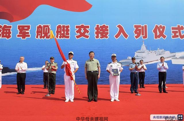 4月23日,海军三型主战舰艇——长征18号艇、大连舰、海南舰在海南三亚某军港集中交接入列。中共中央总书记、国家主席、中央军委主席习近平出席交接入列活动并登上舰艇视察。这是习近平向大连舰授予军旗、命名证书。