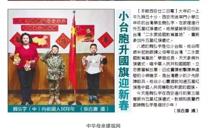 仪礼后,魏弘宇双手举持“向祖国人民拜年”的大红字幅宣誓,“从小要爱国,当好中国人!”他祝愿台湾亲友们和大家春节快乐!还希望能早日回到台湾二水爱祖国教育基地,重新参加举升五星红旗仪礼。