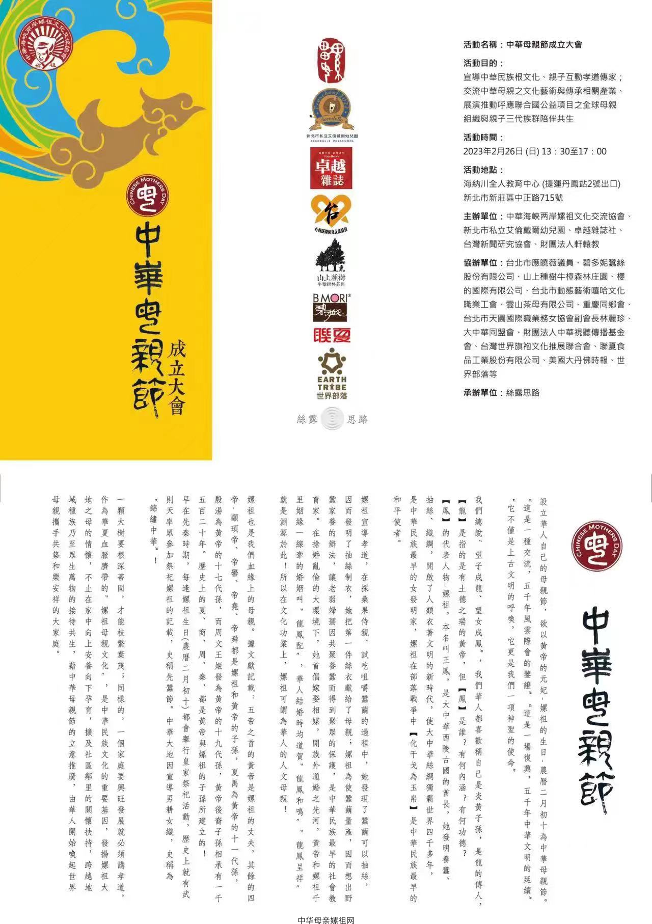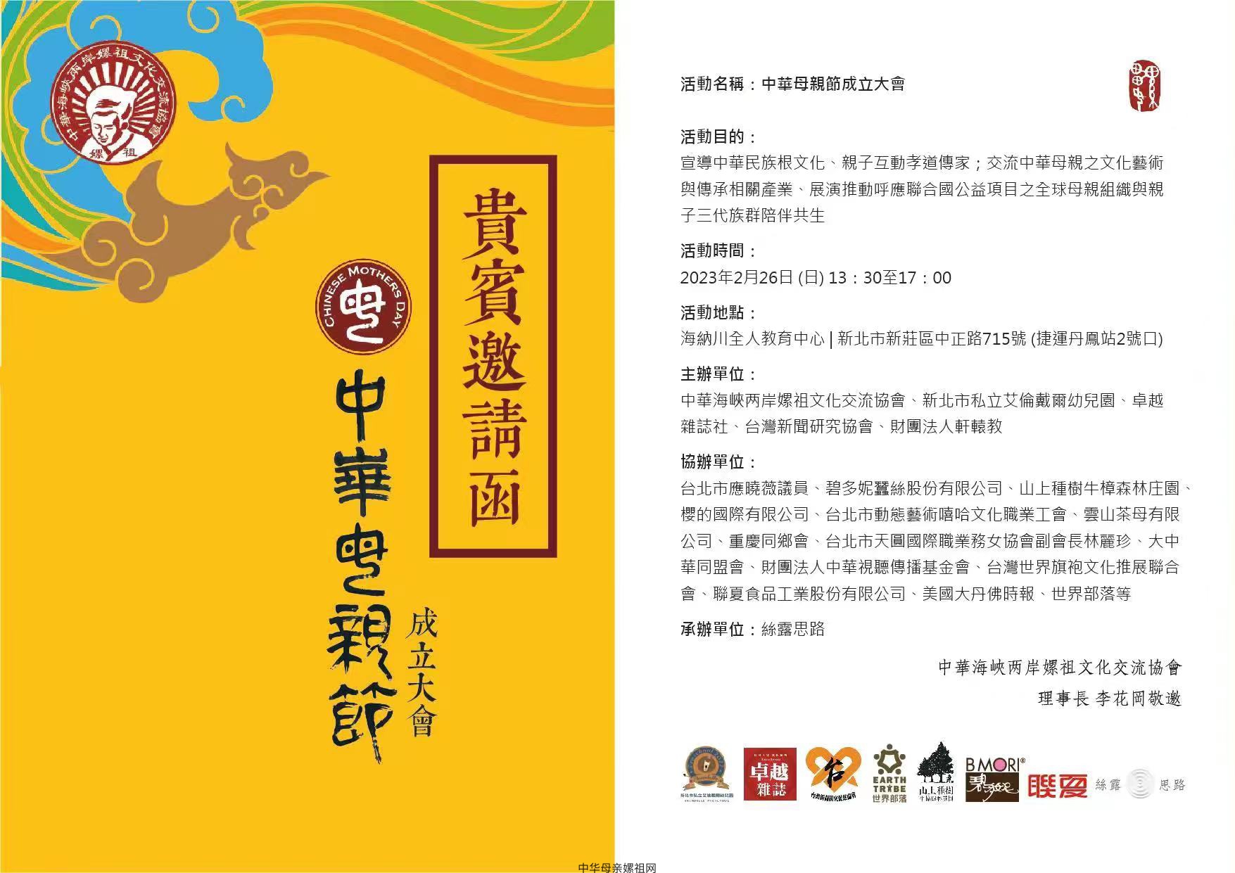 中国台湾「中华母亲节」成立大会的活动于2月26日周日举办,中国人有了自己的母亲节,以黄帝的元妃嫘祖的生日,农历二月初十为中华母亲节的创意缘起。催生的中华海峡两岸嫘祖文化交流协会理事长李花岗说,根据史料嫘祖是血缘上的中华民族之母,以天下部落为一家的大统一思想,协和百族,化干戈为玉帛,辅佐黄帝统一中原。