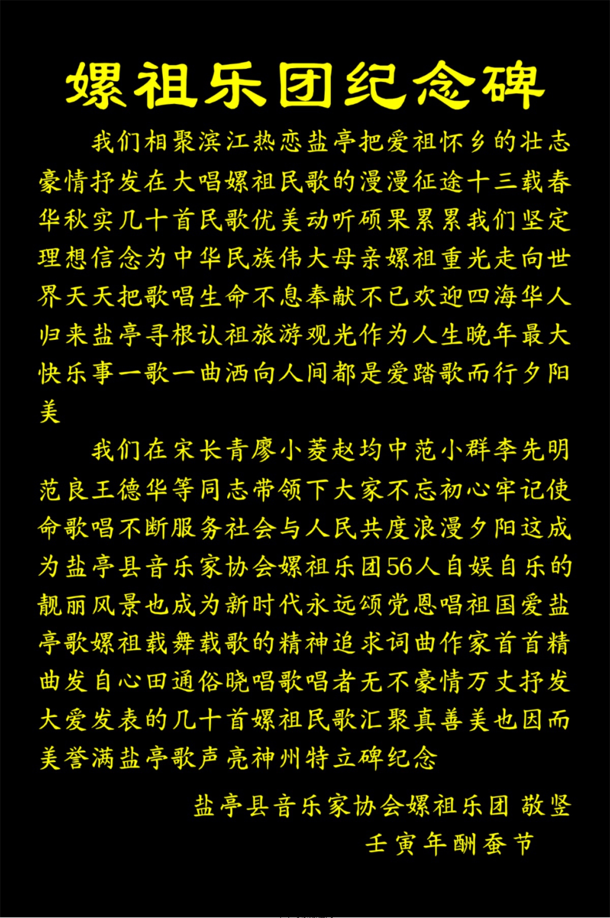 乐团队员们有积极乐观健康向上美好的精神生活追求,有爱祖爱乡的火热情怀。因为,我们是自豪的盐亭人。始终不渝传承优秀嫘祖文化,其乐无穷。追求不已,服务人民,惠及后世。这些精神佳作使伟大的先蚕嫘祖,“千古故事美,民歌永流传”。