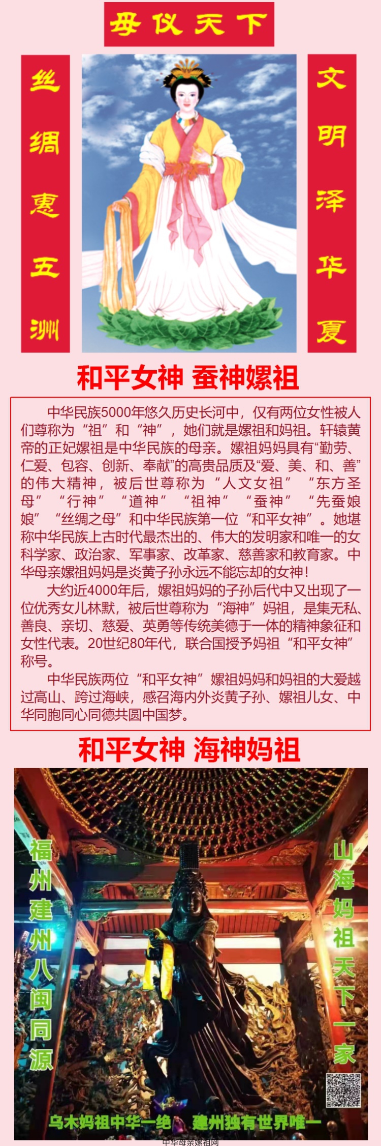 “丝绸之母”、“和平女神”嫘祖妈妈和“和平女神”、“海神”妈祖的大爱将传遍祖国大江南北、越过高山跨过海峡,激励两岸三地中华同胞同心同德同圆中国梦。