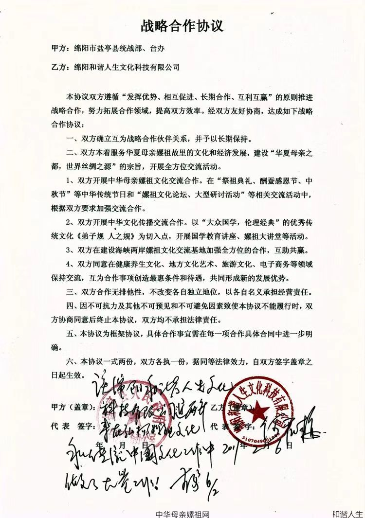 2021年4月29日,绵阳和谐人生文化科技有限公司与浙江缙善招商服务有限公司在浙江丽水缙云仙都风景区(国家5A级风景区)签约,浙江缙善正式加盟“嫘祖文化科技产业联盟”。北京地山谦生物科技有限公司董事长朱程现场鉴证签约。