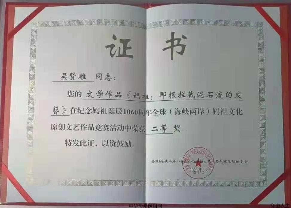 知名剧作家吴贤雕先生的文学作品《妈祖:那根拦截泥石流的发簪》。该文在纪念妈祖诞辰1060周年全球(海峡两岸)妈祖文化原创文艺作品竞赛活动中荣获二等奖。