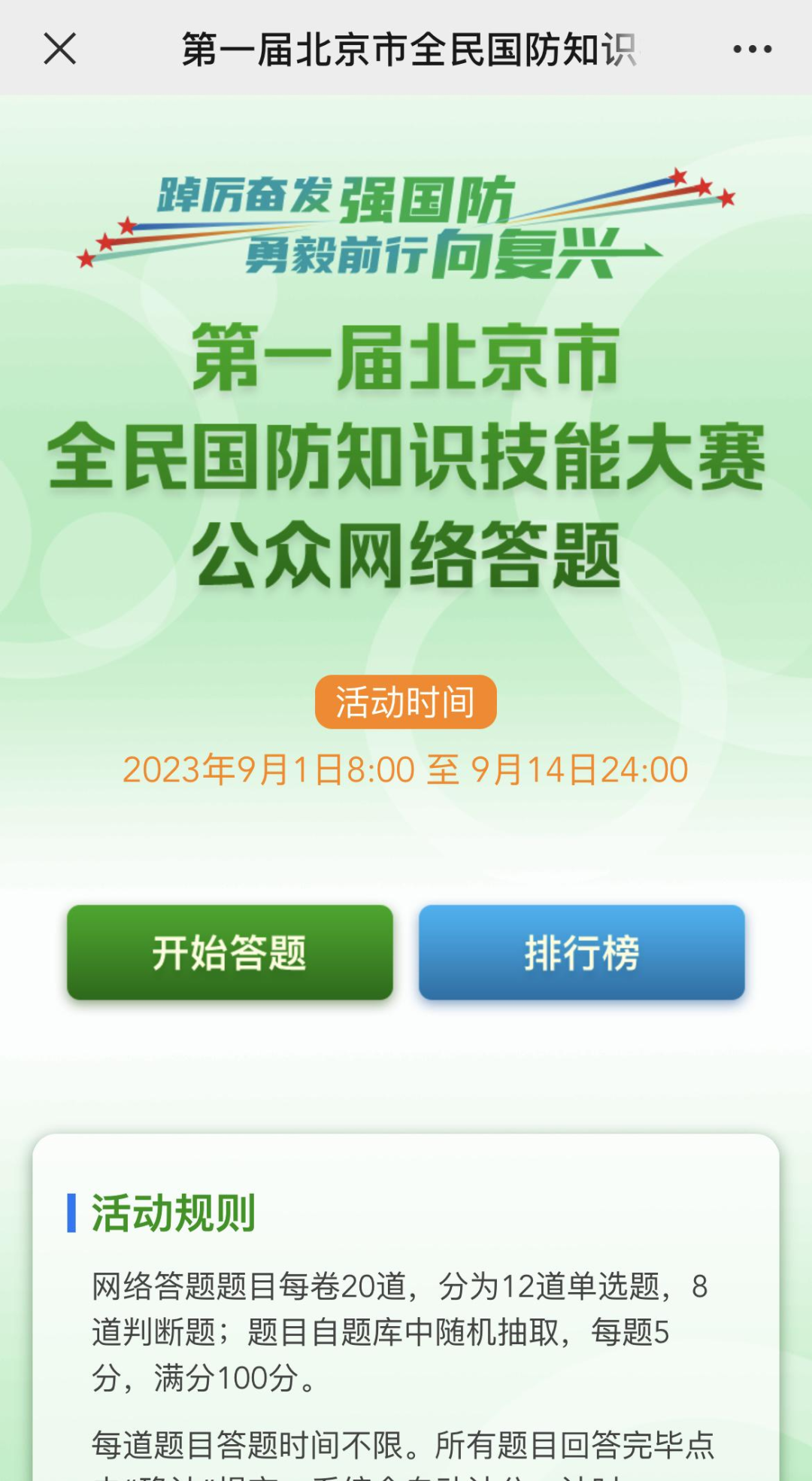 2023年9月16日是我国第23个全民国防教育日。北京市委宣传部、市国防动员办公室、市委教育工委、市教委、市退役军人事务局、北京卫戍区政治工作部于9月共同主办“第一届北京市全民国防知识技能大赛”。