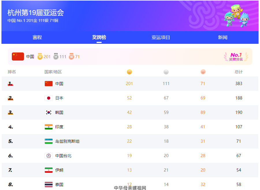 10月8日中午,杭州亚运会所有项目完赛。中国体育代表团获得201金111银71铜,共383枚奖牌,取得亚运会参赛历史最好成绩。自1982年第九届亚运会以来,中国体育代表团连续第十一次位居亚运会金牌榜榜首。