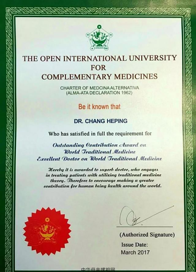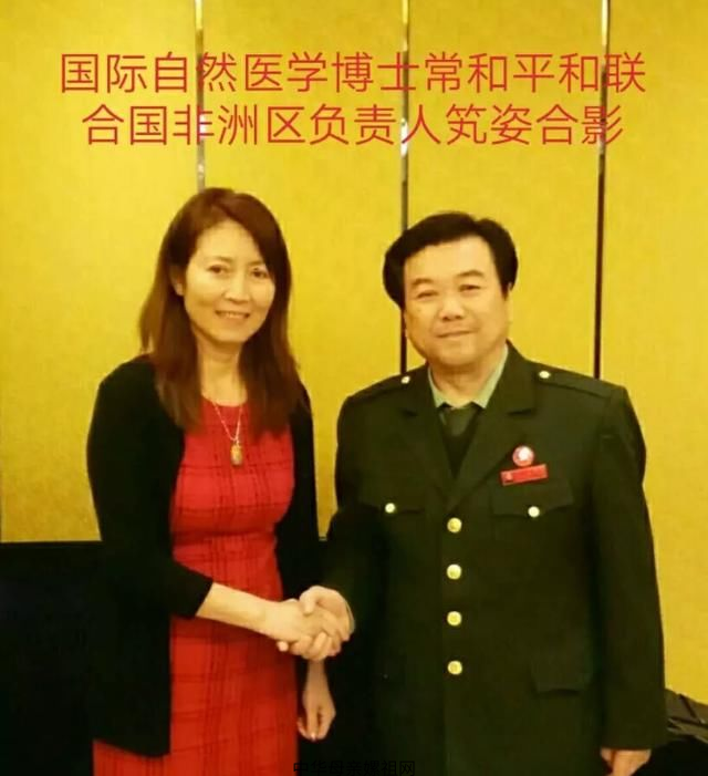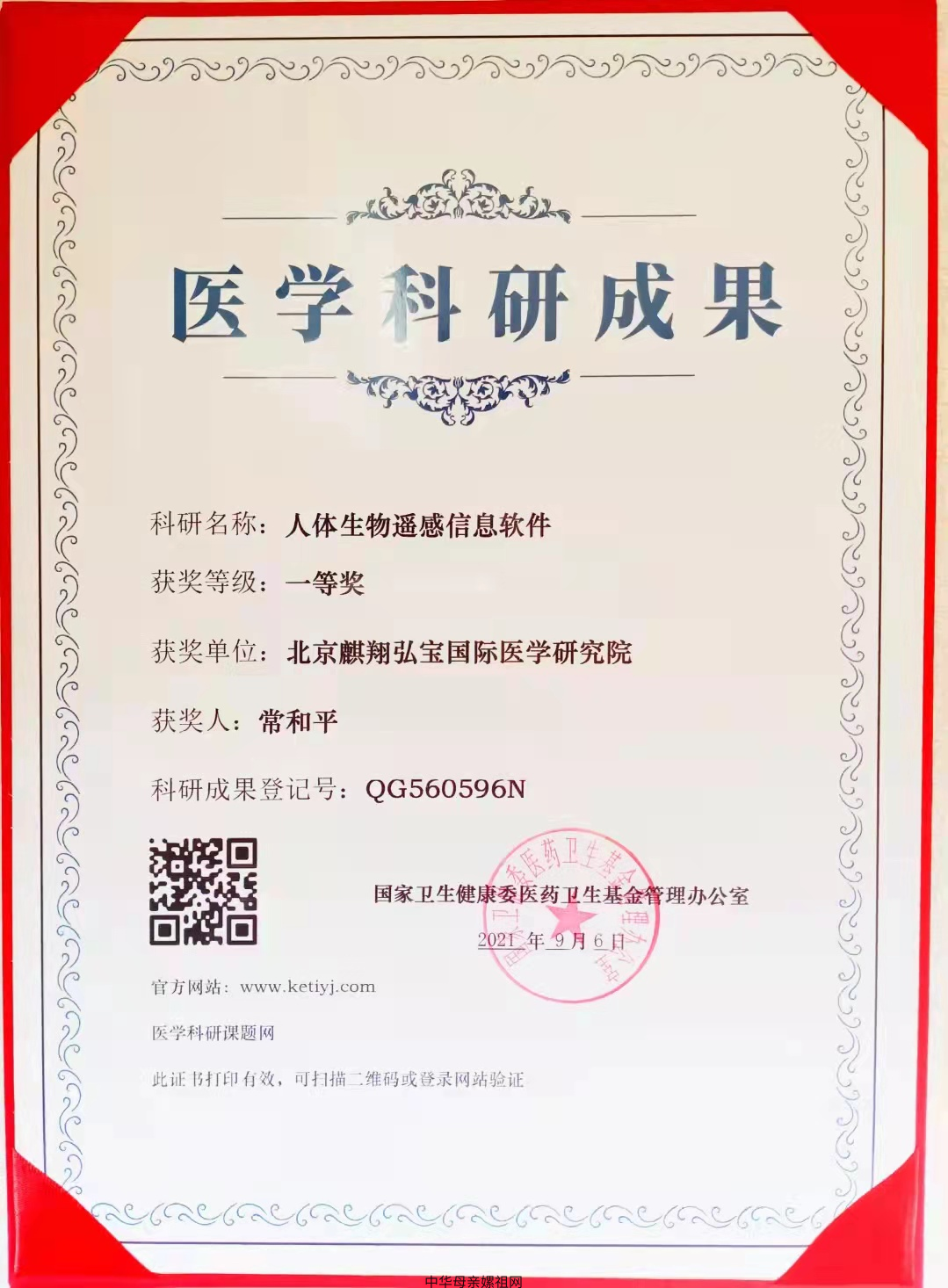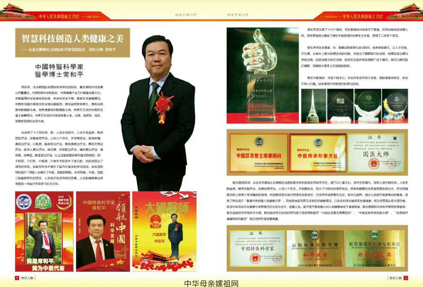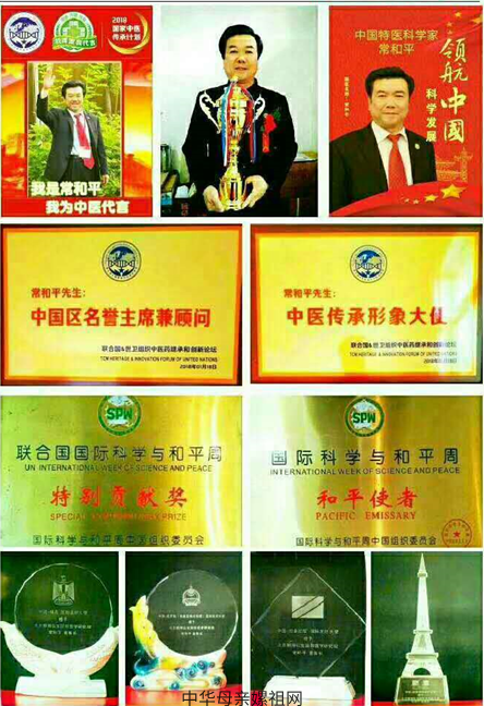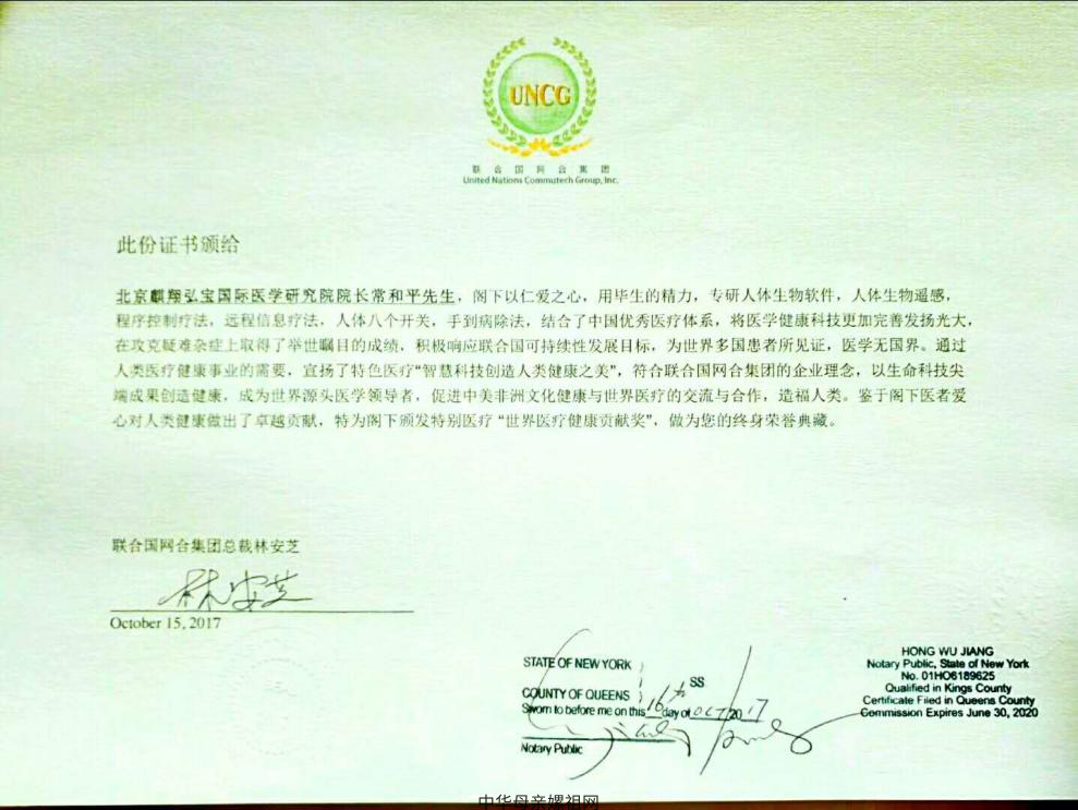 联合国颁奖词:此份证书颁给北京麒翔弘宝国际医学研究院院长常和平先生,阁下以仁爱之心,用毕生的精力,专研人体生物软件,人体生物遥感,程序控制疗法,远程信息疗法,人体八个开关,手到病除法,结合了中国优秀医疗体系,将医学健康科技更加完善发扬光大,在攻克疑难杂症上取得了举世瞩目的成绩,积极响应联合国可持续性发展目标,为世界多国患者所见证,医学无国界。通过人类医疗健康事业的需要,宣扬了特色医疗“智慧科技创造人类健康之美”,符合联合国世界卫生组织的健康理念,以生命科技尖端成果创造健康,成为世界源头医学领导者,促进中美非洲文化健康与世界医疗的交流与合作,造福人类。鉴于阁下医者爱心对人类健康做出了卓越贡献,联合国国际科学和平周特别贡献奖:联合国国际和平周和平大使:联合国世界卫生组织特为阁下颁发特别医疗“中国区名誉主席兼顾问”“中医发展传承形象大使”“世界医疗健康特别贡献奖”做为您的终身荣誉典藏。