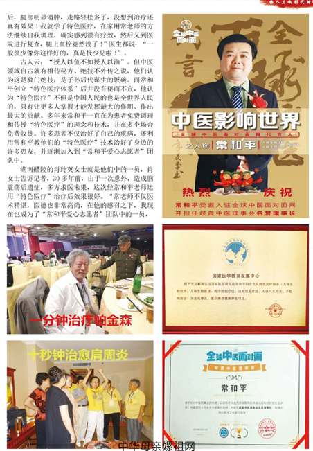 特医古文化终身贡献奖:中国古老历史中的言语俗称 :假传万卷书,真传一句话;学来万句少,悟透一句多;宁给一寸金,不给一个字,一字值千金;快刀铡乱麻;长痛不如短痛;手到病除;点到为止;弹指一挥间;聚则成型,散则无型;等等俗语在常和平先生这里全部变成了现实,并通过了多年的临床实践,均取得了神奇的效果,为人类医学创造出了非药物治疗各种各样疑难疾病的奇迹。为此联合国世界网合教科文组织特为常和平先生颁发特医古文化终身贡献奖以此奖励。