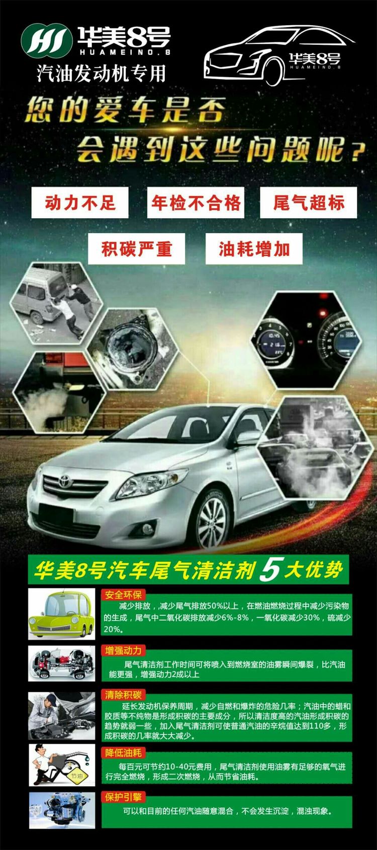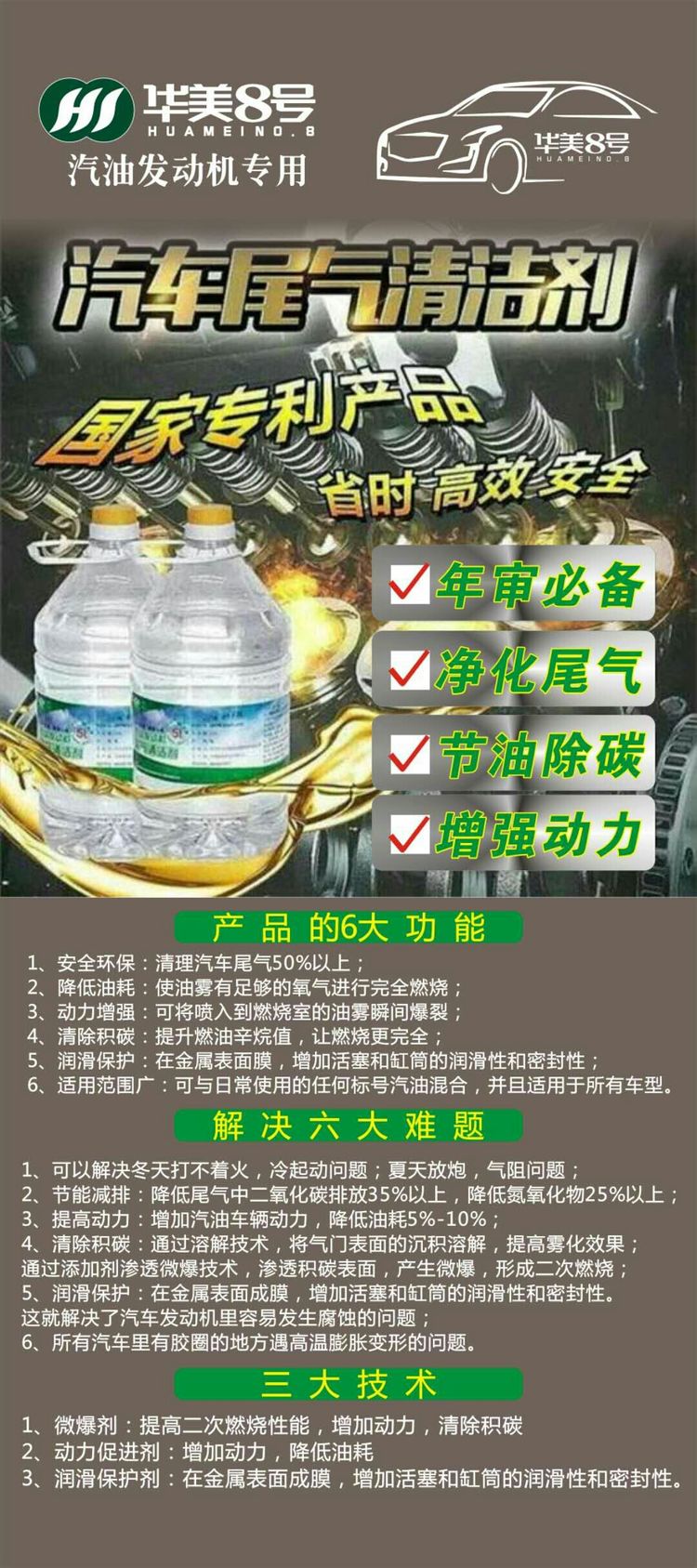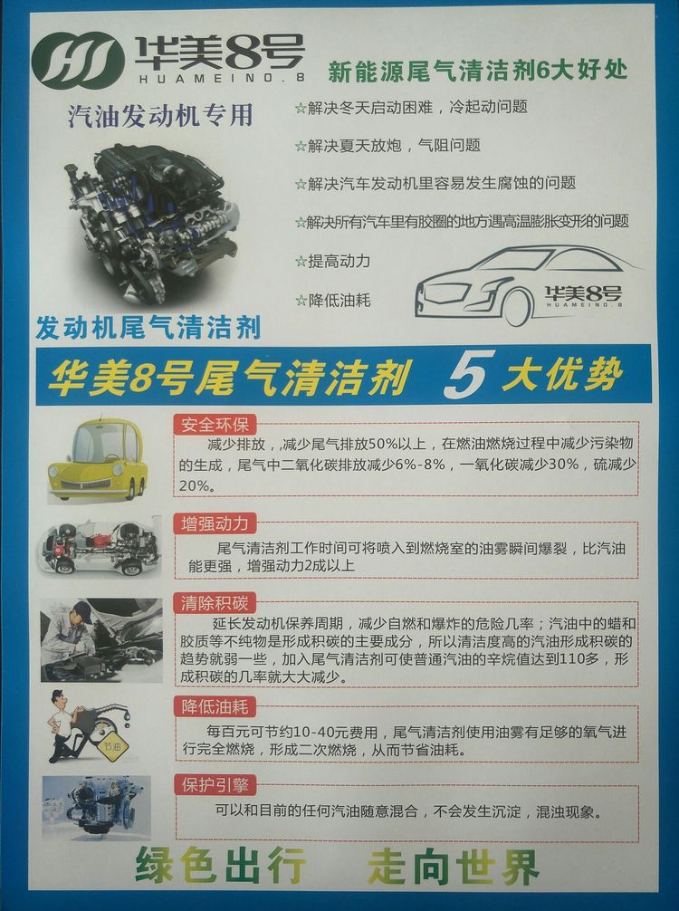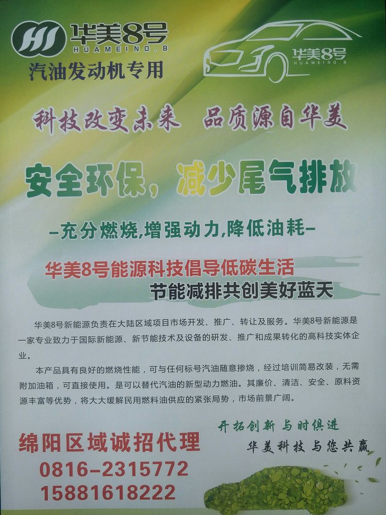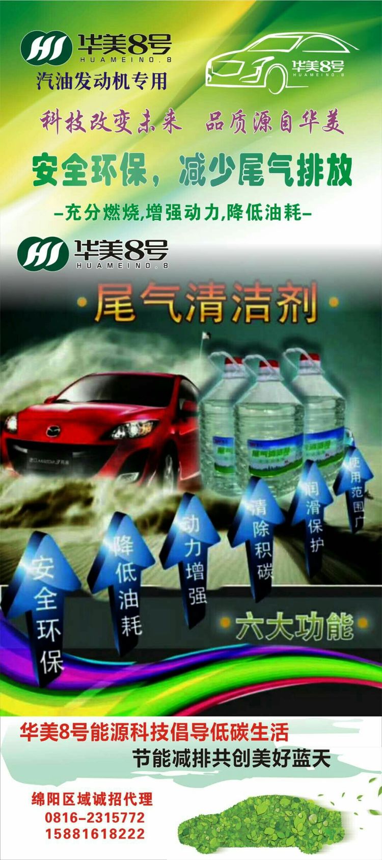 为了节能减排、低碳出行,给后代子孙留下美好的蓝天和清新的空气,让人们免受汽车尾气毒害,绵阳特乐环保科技有限公司隆重推出华美8号新能源汽车尾气清洁剂。本产品具有良好的燃烧性能,可与任何标号的汽油掺烧,无需附加油箱,可直接使用,是可以替代汽油的新型动力燃油。其廉价、清洁、安全、原料资源丰富等优势,将大大缓解民用燃油供应的紧张局势,市场前景广阔。现在绵阳区域诚招代理,望大家相互转告!