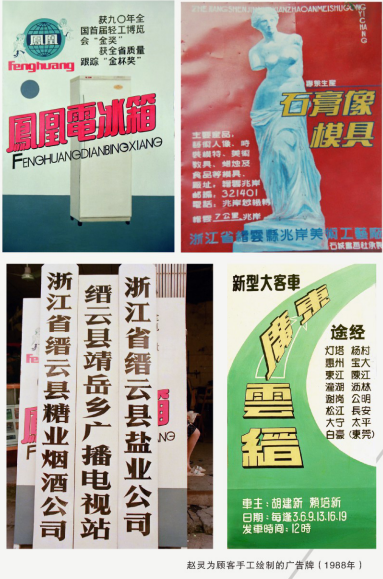 1988年,刚步入婚姻的赵灵,为了寻求一个创作书画的空间,她结束了打工生涯,然后在新华书店买了一本美术字的书本,开始一笔一画地学习了起来,再走街串巷去看人家挂在店门口的广告招牌,模仿学习。她很快掌握了一手书写宋体、黑体、圆体美术字的技巧。她后来去其他县城学习了做泡沫字和有机玻璃等技术,然后在自己的宿舍里创办了缙云第一家书画社,主营广告招牌制作。那时没有电脑,完全是靠手工绘制,她希望能够在这个舞台上展示自己的艺术才华,开拓发展空间。