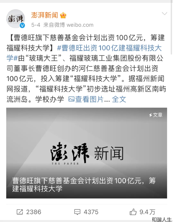 出资100亿!“玻璃大王”曹德旺出资筹建“福耀科技大学”,定位为理工类科技型大学,致力于培养应用型、技术技能型人才。