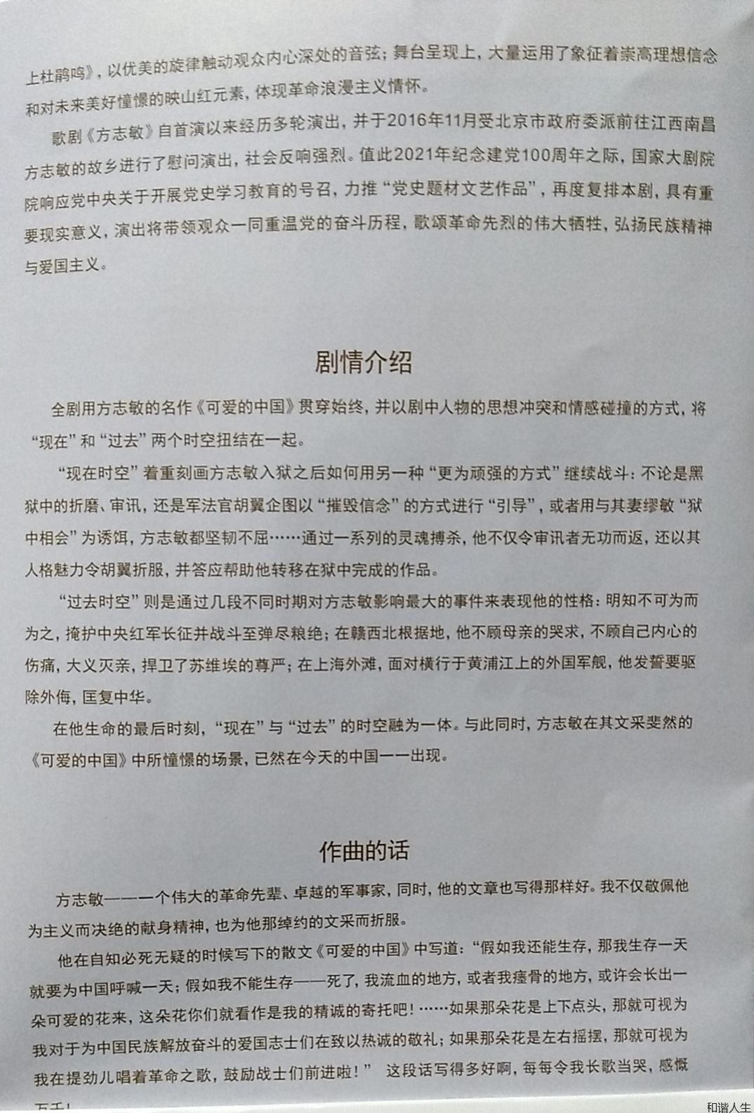 该剧以方志敏与国民党军法处长胡翼在狱中的较量为主线,以其在狱中写就并送出《可爱的中国》等书稿的过程为主要内容,折射出他伟大的爱国主义精神和坚定的共产主义理想。该剧舞台演出形式新颖丰满,音乐真挚动人。开篇合唱《这,是一间囚室》中,合唱团员化身狱中“高墙”,巧妙地交代了方志敏被捕后的艰难处境和愤懑心情;引用江西民歌素材创作的《十送红军》旋律亲切,朗朗上口,表现了红军战士与人民群众水乳交融的关系,以及方志敏与母亲的母子深情;方志敏妻子缪敏的咏叹调《映山红上杜鹃鸣》,从侧面勾勒出一个有血有肉的方志敏,舍小家为大义的选择,更加凸显了其钢铁般坚韧的革命意志; 苏区群众的混声合唱《列宁公园》是剧中最为暖色调的音乐,轻松惬意的旋律,道出百年前人们对未来中国“没有压迫,没有奴役,男耕女织,粗茶淡饭”的美好愿景;主人公牺牲后的咏叹调《假如我还能生存》,是根据他在狱中自知必死无疑的时候写下的散文《可爱的中国》改编而成,将方志敏的灵魂心声抒发到淋漓尽致,也将全剧的爱国情怀升华至顶点,令全场观众动容。