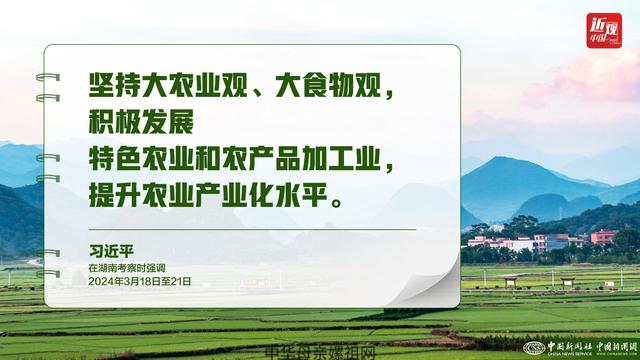 习近平强调,湖南要扛起维护国家粮食安全的重任,抓住种子和耕地两个要害,加快种业、农机关键核心技术攻关。坚持大农业观、大食物观,积极发展特色农业和农产品加工业,提升农业产业化水平。