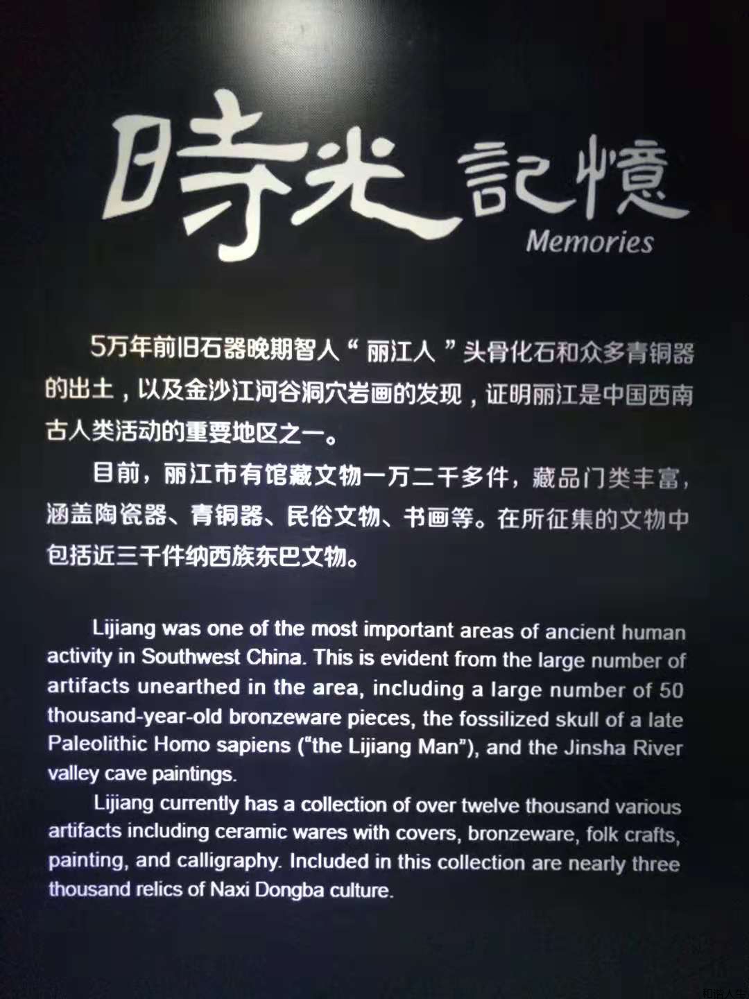 展示馆以《世界文化遗产丽江古城志》为蓝本,通过陈列、图文、声、光、电、多媒体演示和数字表现等形式,采用中、英双语,全面展示了丽江古城的历史沿革、文化特色、遗产保护、自然环保等内容。