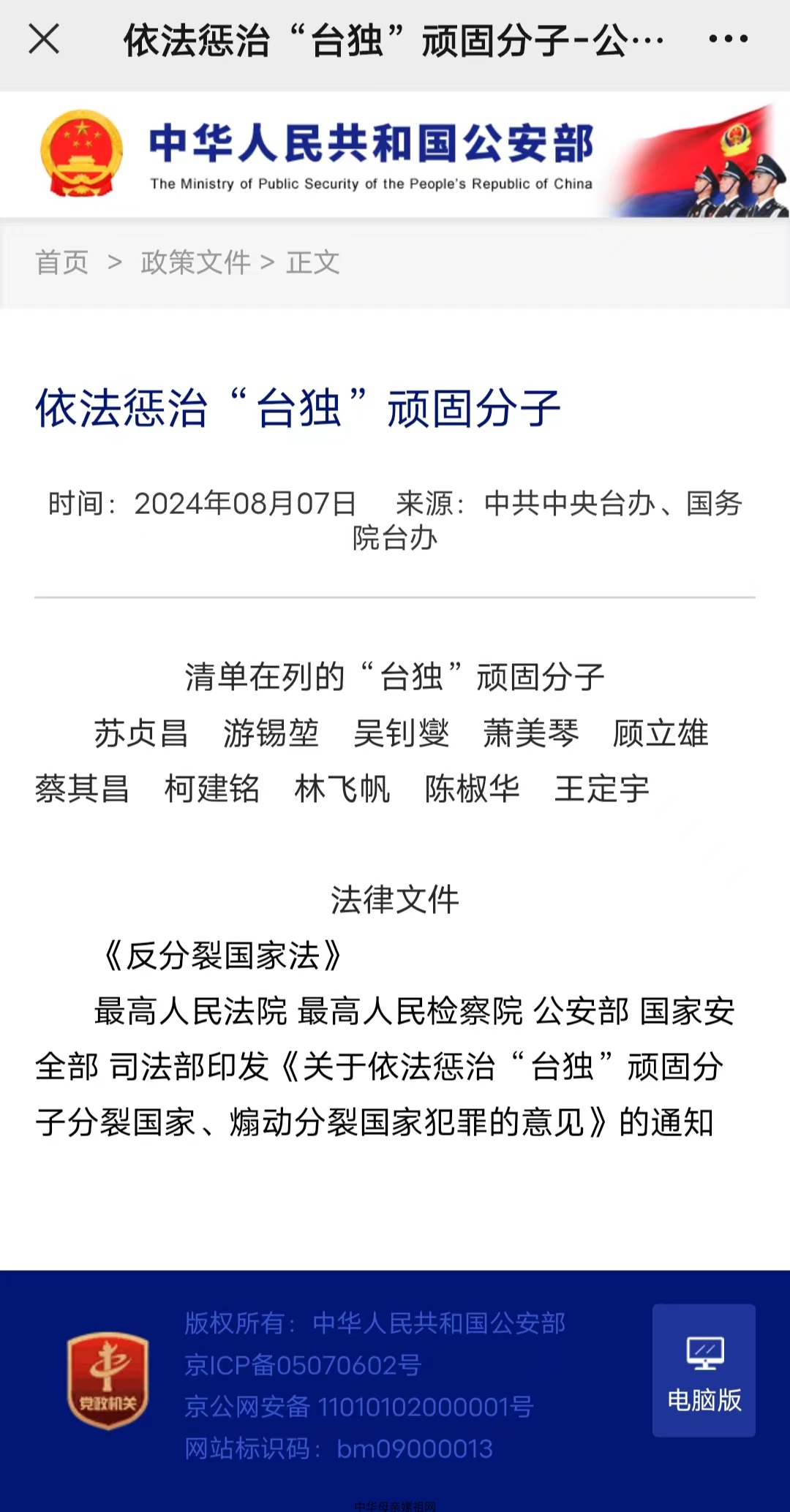 1.世界上只有一个中国,台湾是中国领土不可分割的一部分。极少数“台独”顽固分子大肆进行“台独”分裂活动,严重危害台湾海峡地区和平稳定,严重损害两岸同胞共同利益和中华民族根本利益。人民法院、人民检察院、公安机关、国家安全机关和司法行政机关要充分发挥职能作用,依法严惩“台独”顽固分子分裂国家、煽动分裂国家犯罪,坚决捍卫国家主权、统一和领土完整。