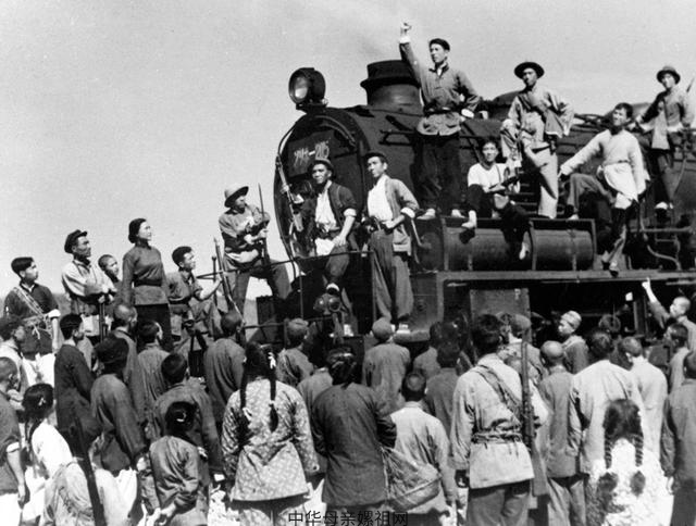 这是电影《铁道游击队》的一个镜头:铁道游击队在打了日寇的票车后,向群众宣传抗日斗争。 新华社发