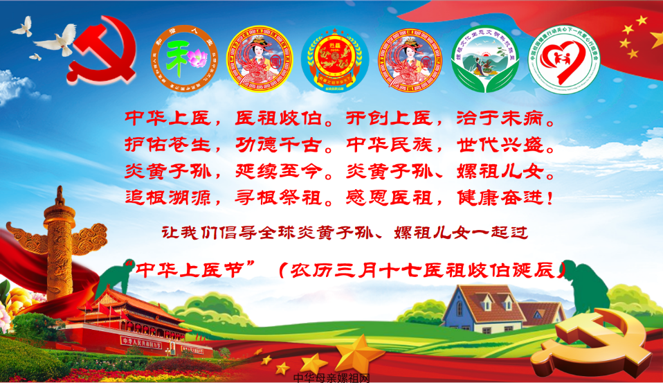 为了多形式开展对外宣传交流活动,弘扬岐伯文化,提升岐伯中医药文化的影响力,增强炎黄子孙对华夏中医始祖岐伯的民族认同和文化认同,建设健康中国,和谐人生、嫘祖书院和中华母亲嫘祖网倡导全球炎黄子孙、嫘祖儿女一起过“中华上医节”(农历三月十七医祖歧伯诞辰)!