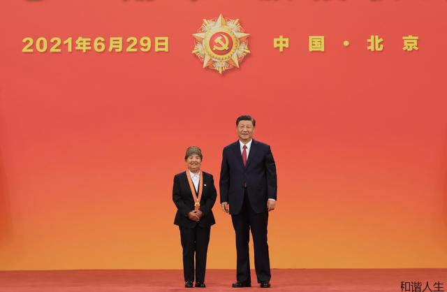 新华社照片,北京,2021年6月29日 庆祝中国共产党成立100周年“七一勋章”颁授仪式在京隆重举行 6月29日,庆祝中国共产党成立100周年“七一勋章”颁授仪式在北京人民大会堂金色大厅隆重举行。中共中央总书记、国家主席、中央军委主席习近平向“七一勋章”获得者王兰花颁授勋章。 新华社记者 李学仁 摄