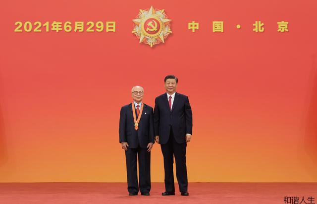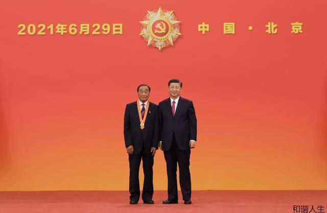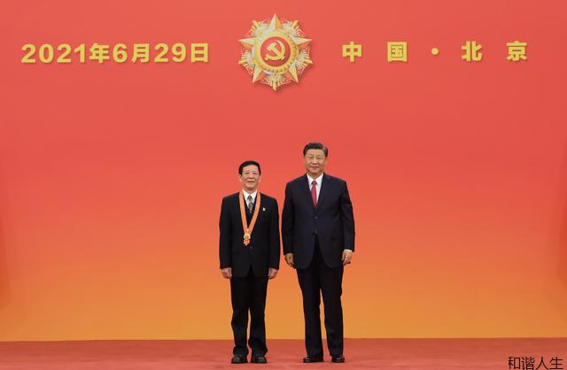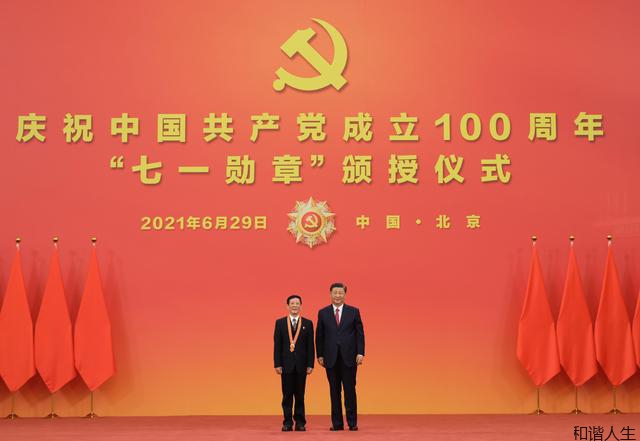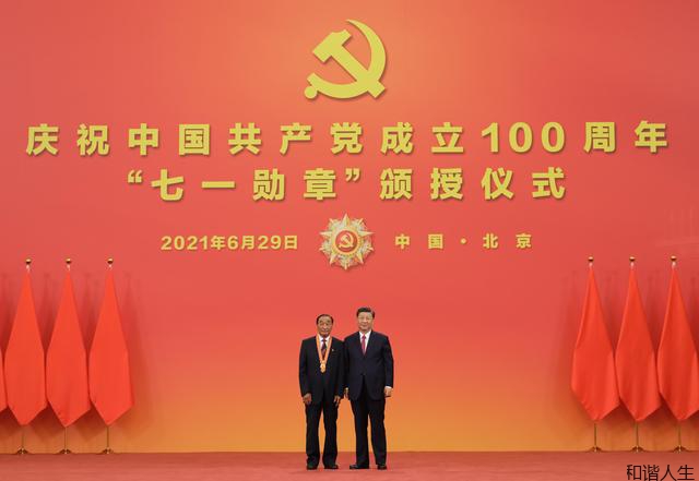 新华社照片,北京,2021年6月29日 庆祝中国共产党成立100周年“七一勋章”颁授仪式在京隆重举行 6月29日,庆祝中国共产党成立100周年“七一勋章”颁授仪式在北京人民大会堂金色大厅隆重举行。中共中央总书记、国家主席、中央军委主席习近平向“七一勋章”获得者艾爱国颁授勋章。 新华社记者 李学仁 摄