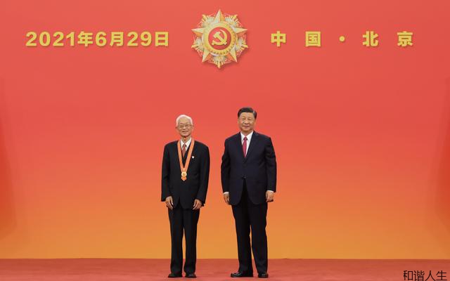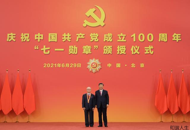 新华社照片,北京,2021年6月29日 庆祝中国共产党成立100周年“七一勋章”颁授仪式在京隆重举行 6月29日,庆祝中国共产党成立100周年“七一勋章”颁授仪式在北京人民大会堂金色大厅隆重举行。中共中央总书记、国家主席、中央军委主席习近平向“七一勋章”获得者吕其明颁授勋章。 新华社记者 李学仁 摄