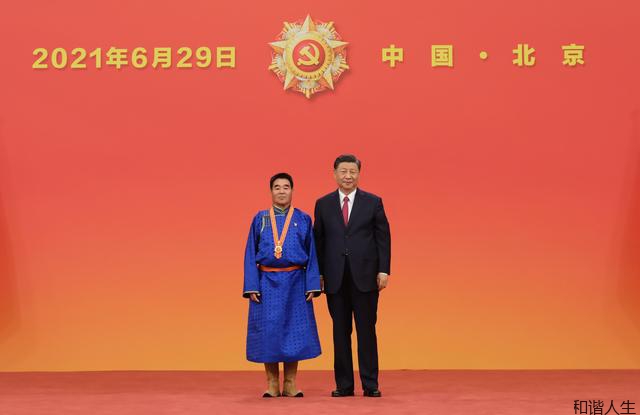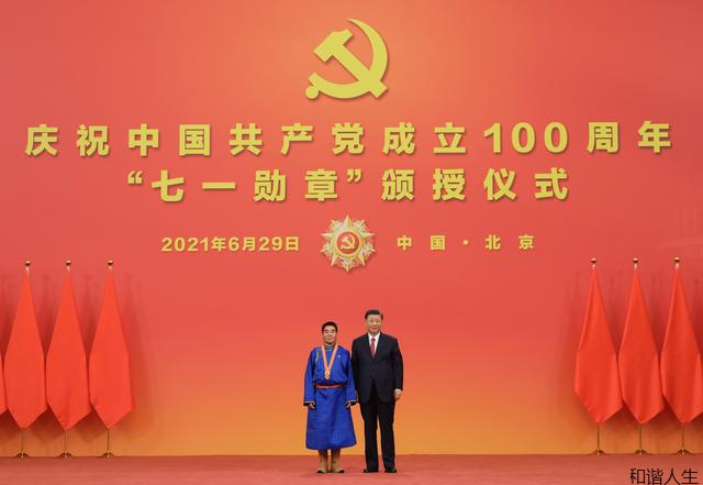 新华社照片,北京,2021年6月29日 庆祝中国共产党成立100周年“七一勋章”颁授仪式在京隆重举行 6月29日,庆祝中国共产党成立100周年“七一勋章”颁授仪式在北京人民大会堂金色大厅隆重举行。中共中央总书记、国家主席、中央军委主席习近平向“七一勋章”获得者廷·巴特尔颁授勋章。 新华社记者 李学仁 摄
