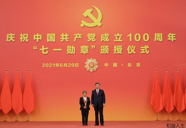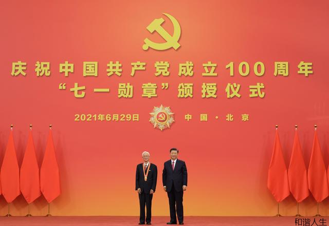 新华社照片,北京,2021年6月29日 庆祝中国共产党成立100周年“七一勋章”颁授仪式在京隆重举行 6月29日,庆祝中国共产党成立100周年“七一勋章”颁授仪式在北京人民大会堂金色大厅隆重举行。中共中央总书记、国家主席、中央军委主席习近平向“七一勋章”获得者刘贵今颁授勋章。 新华社记者 李学仁 摄