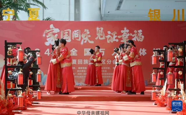 9月22日,在宁夏银川市,新人在“家国同庆 见证幸福”2024年全国万人集体婚礼宁夏分会场展示“农村婚俗新风光荣证”。新华社记者 王鹏 摄