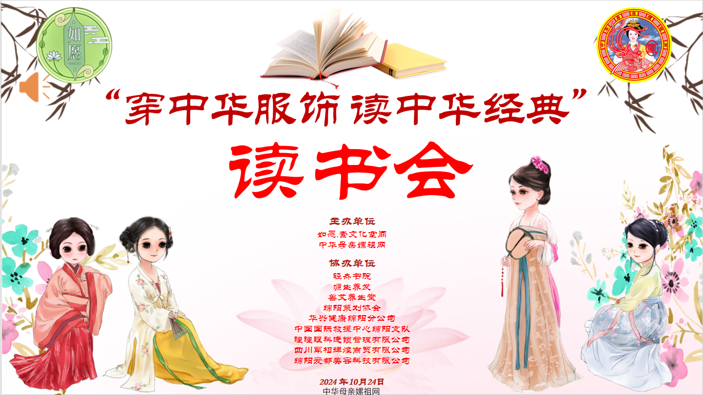 2024年10月24日“穿中华服饰 读中华经典”读书会在中华母亲嫘祖故里——中国科技城绵阳如愿.素文化空间隆重举行,并取得了圆满成功。如愿.素文化空间携手中华母亲嫘祖网共同主办本次别开生面的读书会,旨在通过穿汉服、读经典,弘扬中华母亲嫘祖圣母文化引领的中华优秀传统文化,增强文化自信,传播健康养生理念,助力建设健康中国、实现中华民族伟大复兴。