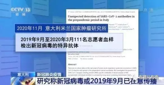 根据英国《镜报》和美国《华盛顿邮报》报道,意大利研究人员去年11月的一项研究,对959名接受过肺癌筛查的人的血液样本检测,其中发现111人的新冠病毒抗体检测结果呈阳性。而该批人群最早的样本采集时间是2019年10月第一周。2019年10月已经有新冠抗体了,说明这批意大利居民最少在2019年9月就已感染。