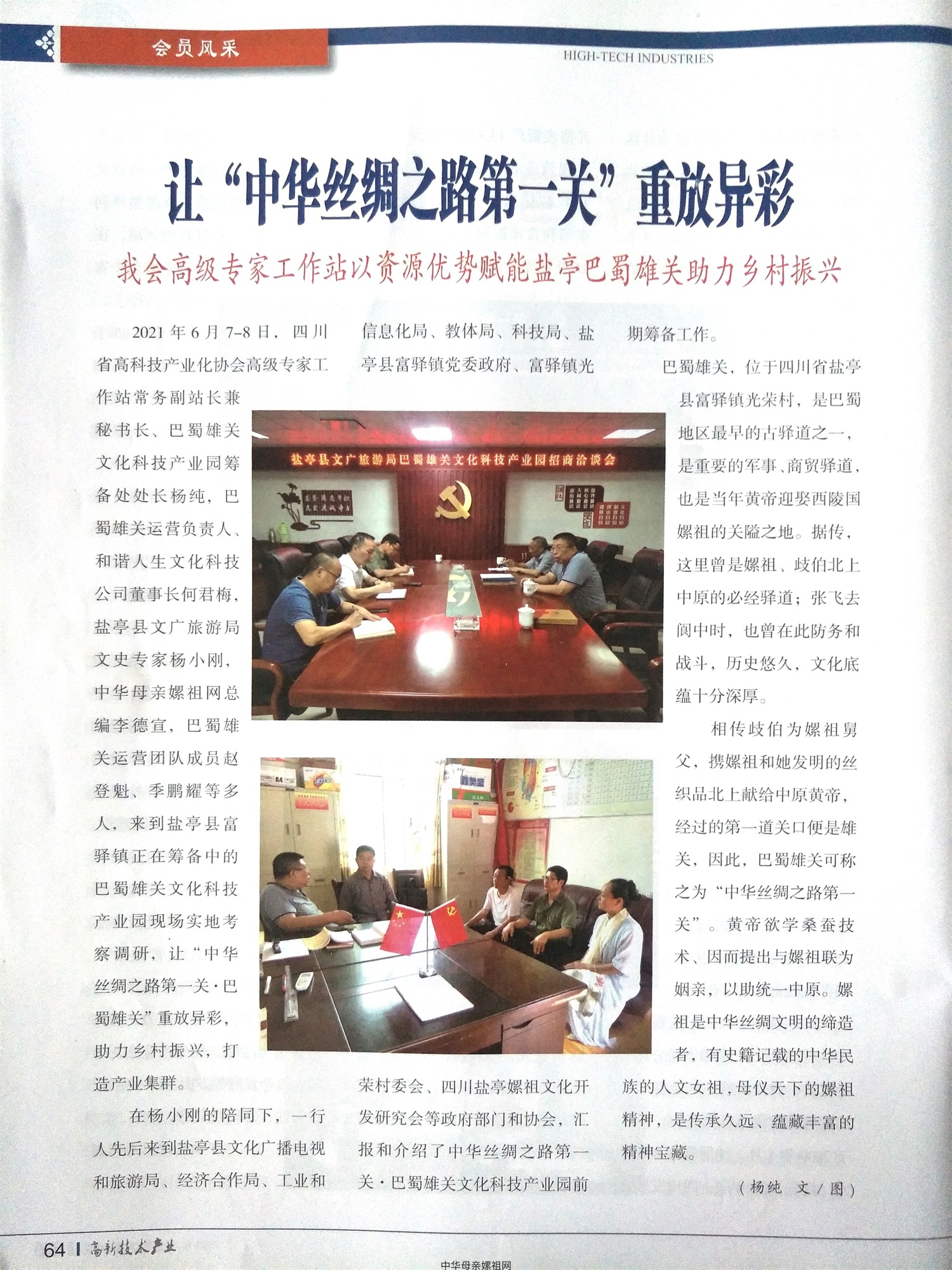 在杨小刚的陪同下,一行人先后来到盐亭县文化广播电视和旅游局、经济合作局、工业和信息化局、教体局、科技局、盐亭县富驿镇党委政府、富驿镇光荣村委会、四川盐亭嫘祖文化开发研究会等政府部门和协会,汇报和介绍了中华丝绸之路第一关·巴蜀雄关文化科技产业园前期筹备工作。