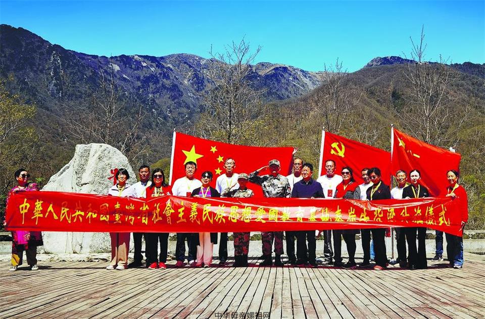 台湾爱国义勇人士魏明仁在秦岭牛背梁举行升旗仪式并同学习旅游的各地民众合照。 (叶贤义 摄)