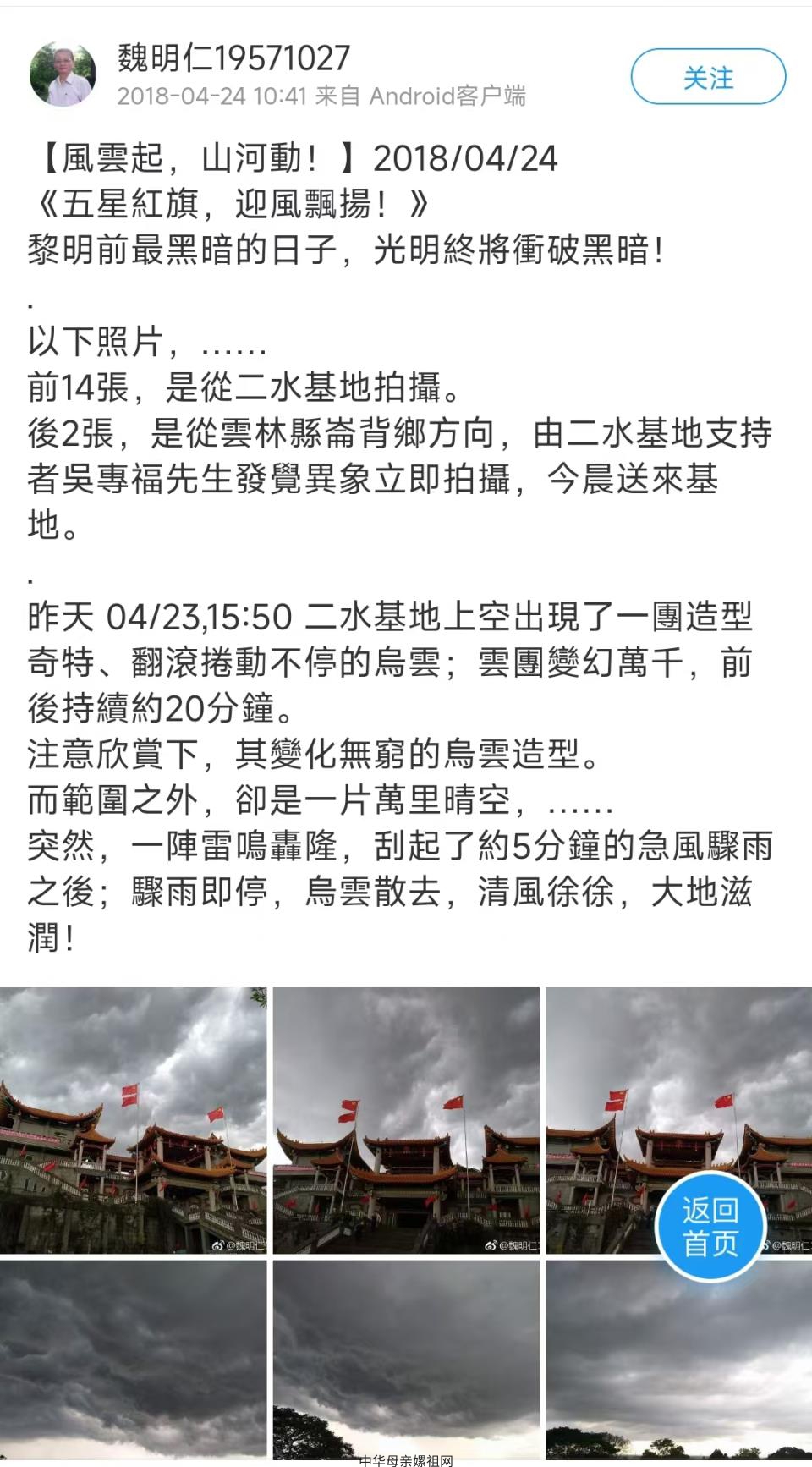 魏明仁先生,是台湾省首先在自家地境上创建“中华人民共和国台湾省社会主义民族思想爱国教育基地”,并每天持续面向北京举行庄严隆重的升旗仪式,引致“台独”“妖孽”惊恐,此基地即遭受蔡英文当局强拆并残害打压的台湾爱国义勇人士之一。