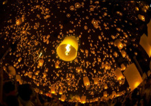 泰国:农历七月十五当天将会举办水灯节,人们放天灯为逝去的亡灵祈福。