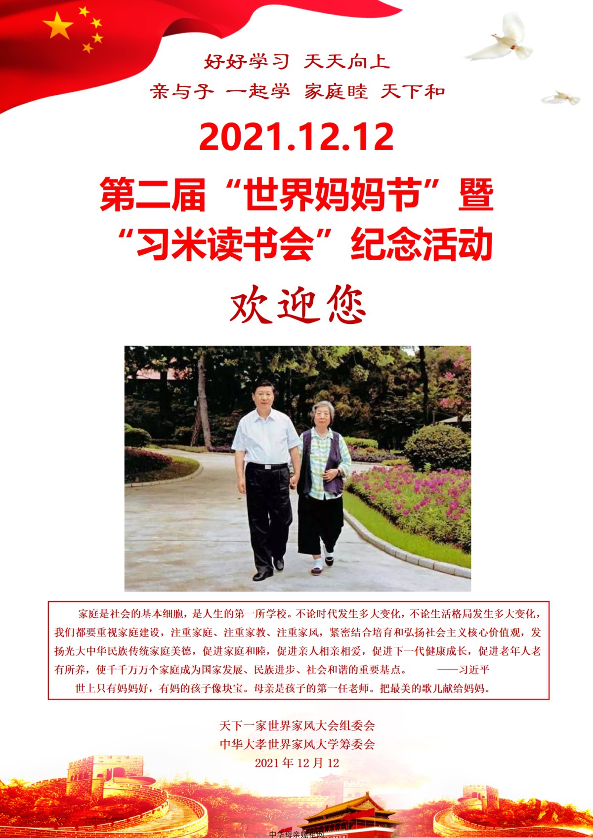 为了响应习近平主席“深入挖掘中华优秀传统文化蕴含的思想观念、人文精神、道德规范,结合时代要求继承创新,让中华文化展现出永久魅力和时代风采。”的号召,更好地弘扬中华母亲嫘祖文化,传承爱美和善嫘祖精神,加快建设“中华母亲著,世界丝绸之源,人文女祖圣地,嫘祖故里盐亭”,引领社会各行各业健康持续发展,贯彻执行《中华人民共和国家庭教育促进法》、《关于进一步加强家庭家教家风建设的实施意见》、《中共中央 国务院关于深化教育教学改革全面提高义务教育质量的意见》、《中共中央国务院关于全面加强新时代大中小学劳动教育的意见》、《关于进一步减轻义务教育阶段学生作业负担和校外培训负担的意见》和《中华人民共和国乡村振兴促进法》,推动国家素质教育的全面实施,提高中华民族整体素质,助力实现中华民族伟大复兴的中国梦,适应世界和谐发展、构建人类命运共同体的需要,中华母亲嫘祖网携手天下一家世界家风大会组委会和中华大孝世界家风大学筹委会联合众多爱心企业共同发起2021.12.12 中华大孝-第二届“世界妈妈节”暨“习米读书会”纪念活动,欢迎社会各界爱心人士的积极参与!