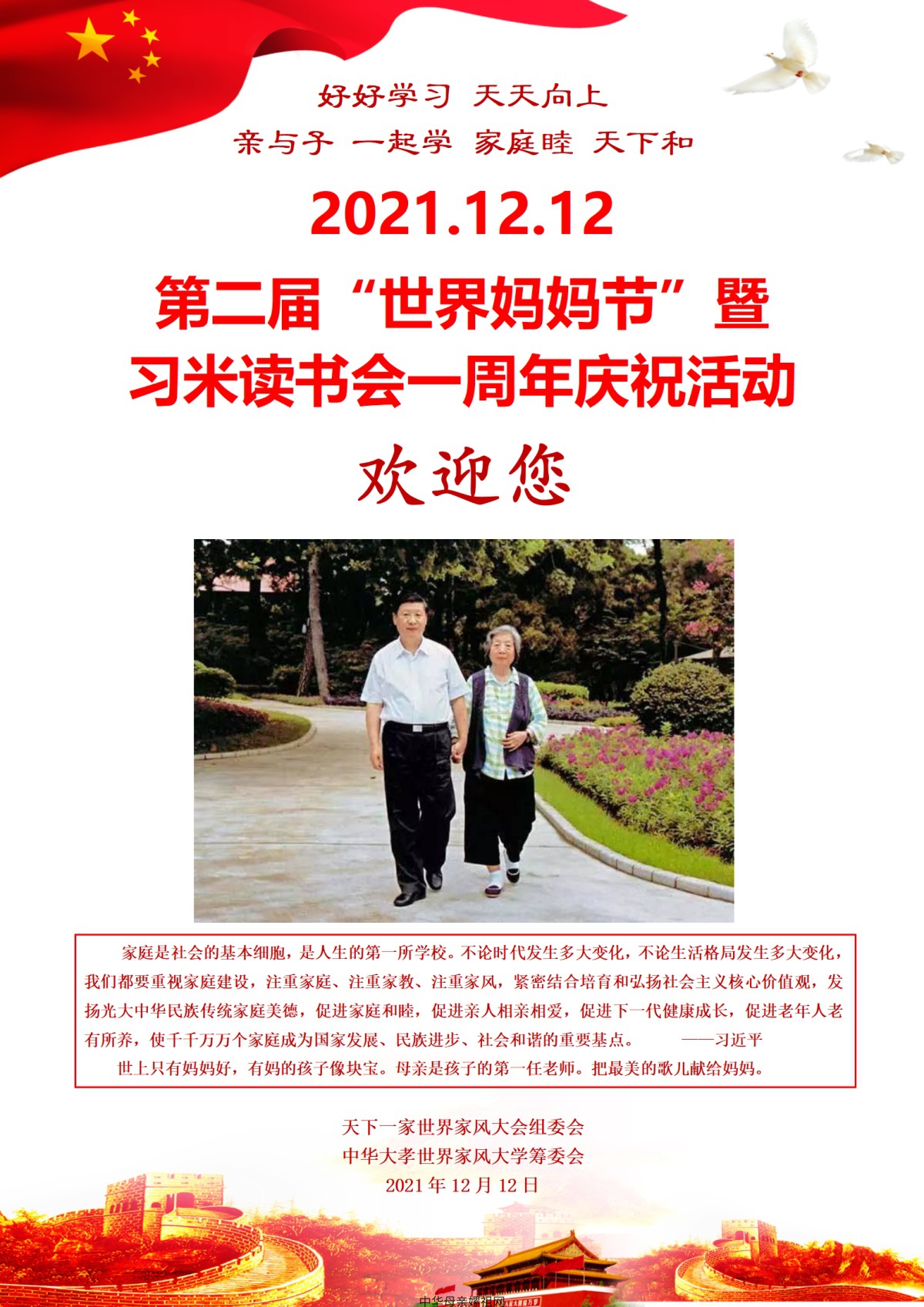 为了响应习近平主席“深入挖掘中华优秀传统文化蕴含的思想观念、人文精神、道德规范,结合时代要求继承创新,让中华文化展现出永久魅力和时代风采。”的号召,更好地弘扬中华母亲嫘祖文化,传承爱美和善嫘祖精神,加快建设“中华母亲著,世界丝绸之源,人文女祖圣地,嫘祖故里盐亭”,引领社会各行各业健康持续发展,贯彻执行《中华人民共和国家庭教育促进法》、《关于进一步加强家庭家教家风建设的实施意见》、《中共中央 国务院关于深化教育教学改革全面提高义务教育质量的意见》、《中共中央国务院关于全面加强新时代大中小学劳动教育的意见》、《关于进一步减轻义务教育阶段学生作业负担和校外培训负担的意见》和《中华人民共和国乡村振兴促进法》,推动国家素质教育的全面实施,提高中华民族整体素质,助力实现中华民族伟大复兴的中国梦,适应世界和谐发展、构建人类命运共同体的需要,中华母亲嫘祖网携手天下一家世界家风大会组委会和中华大孝世界家风大学筹委会联合众多爱心企业共同发起2021.12.12 第二届“世界妈妈节”暨习米读书会“一周年”庆祝活动,欢迎社会各界爱心人士的积极参与!