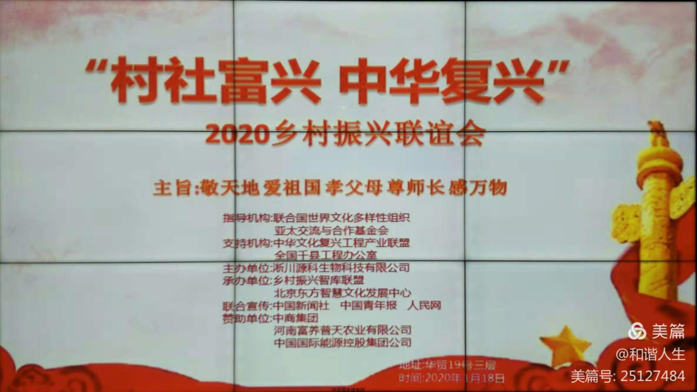 (二)2020年1月18日,“村社富兴 中华复兴”2020乡村振兴联谊会在北京华茂公寓隆重举行。联谊会高朋满座,出席本次活动的嘉宾有联合国世界文化多样性组织执行主席苏秦、原胡主席办公室接待处沈处长、全国千县办公室副主任兼秘书长孔明等。联谊会主旨为“ 敬天地 爱祖国 孝父母 尊师长 馈衆生”。