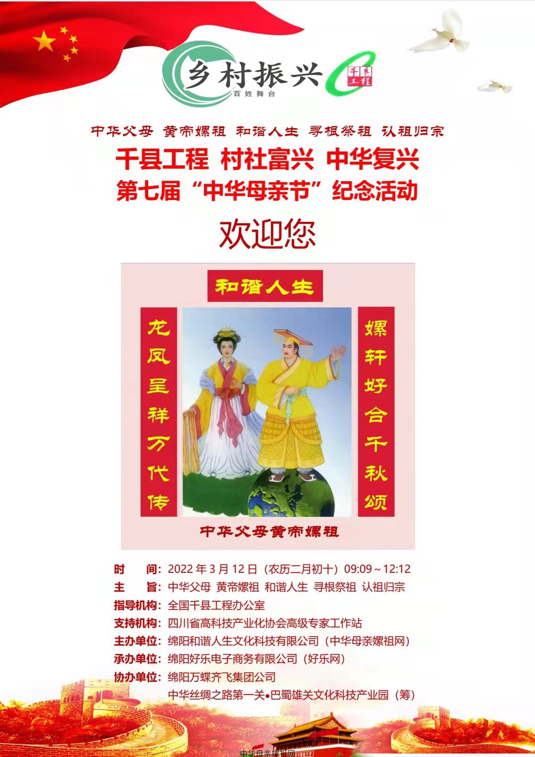 为了响应习近平主席“深入挖掘中华优秀传统文化蕴含的思想观念、人文精神、道德规范,结合时代要求继承创新,让中华文化展现出永久魅力和时代风采。”的号召,弘扬中华传统文化,过好中国传统节日,引领社会各行各业健康持续发展,贯彻执行《关于实施中华优秀传统文化传承发展工程的意见》、《中华人民共和国家庭教育促进法》、《关于进一步加强家庭家教家风建设的实施意见》、《中共中央 国务院关于深化教育教学改革全面提高义务教育质量的意见》和《中华人民共和国乡村振兴促进法》,推动国家素质教育的全面实施,提高中华民族整体素质,进一步增强中华民族的认同感、凝聚力和向心力,不忘初心,牢记使命,振兴民族经济,助力实现中华民族伟大复兴的中国梦,在全国千县工程办公室和四川省高科技产业化协会的指导和支持下,绵阳和谐人生文化科技有限公司主办,绵阳好乐电子商务有限公司承办题为“中华父母 黄帝嫘祖 和谐人生 寻根祭祖 认祖归宗”的第七届“中华母亲节”纪念活动。